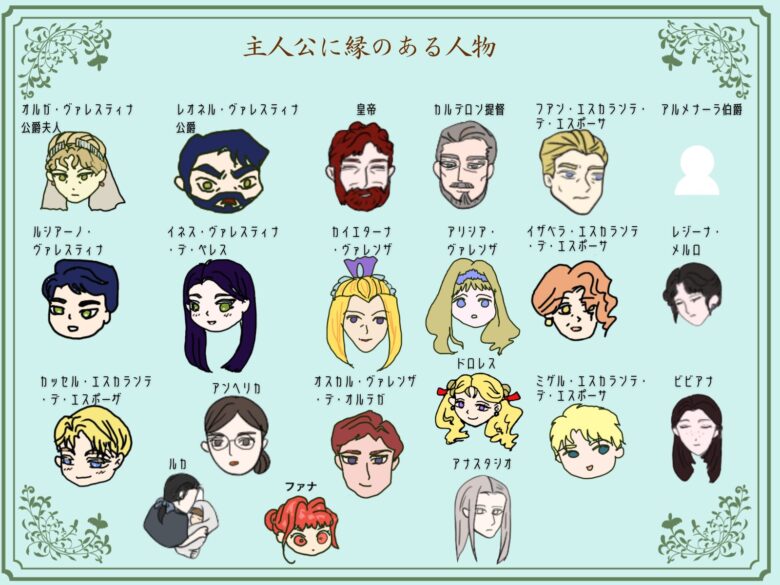 ヴェリンダ・オリバレス :イネスの祖母の名前。前世でイネスがエミリアーノにあげたネックレスに刻印されたイニシャル「V.O」はこの名