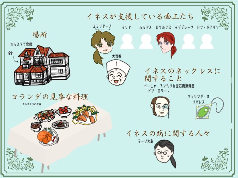 場所/イネスが支援している画工たち/イネスのネックレスに関すること/病に関する人々