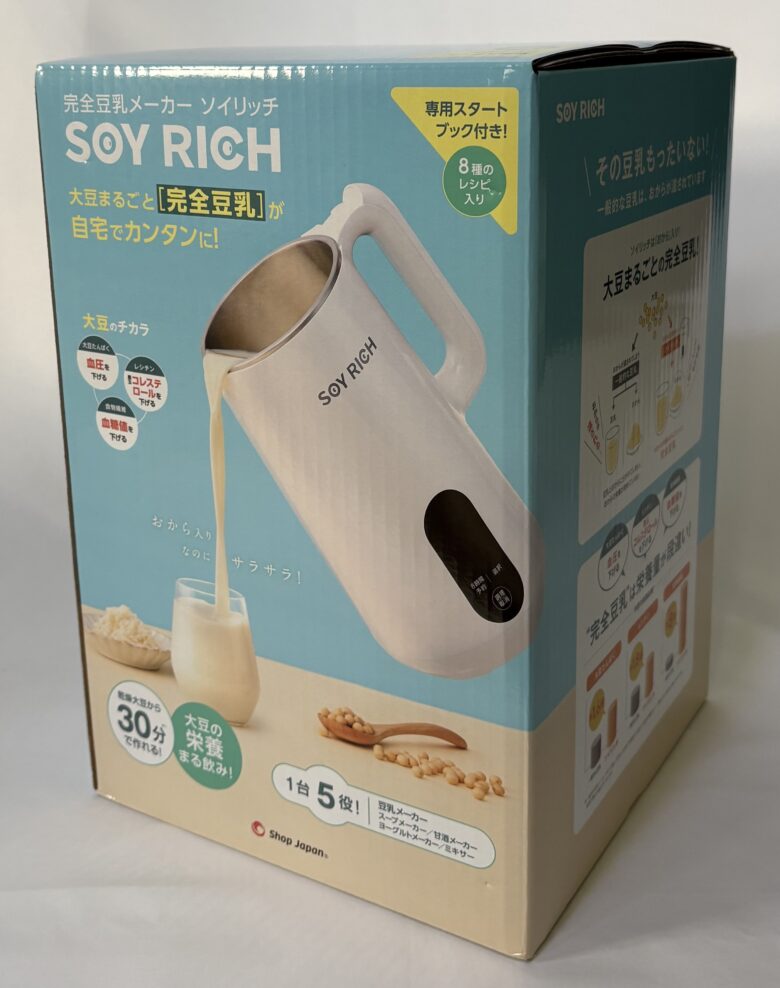 「完全豆乳」という言葉があります。大豆を丸ごと使った豆乳のことです。ショップジャパンから発売されているソイリッチは、乾燥大豆と水を入れるだけで、最短30分で濃厚な完全豆乳を作り出す革新的な調理家電です。